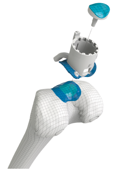 In some patients with one or two focal chondral defects, the potential for cartilage regrowth is limited, and it may be more appropriate to fill the defect with a metal button. The surgeons at Castleview Clinic use the Episealer implant. A virtual 3D model of the damaged femoral knee joint is recreated from an MRI scan. Based on this model, individualized instruments are designed to remove the damaged tissue as well as to restore the area with a perfectly fitting implant.